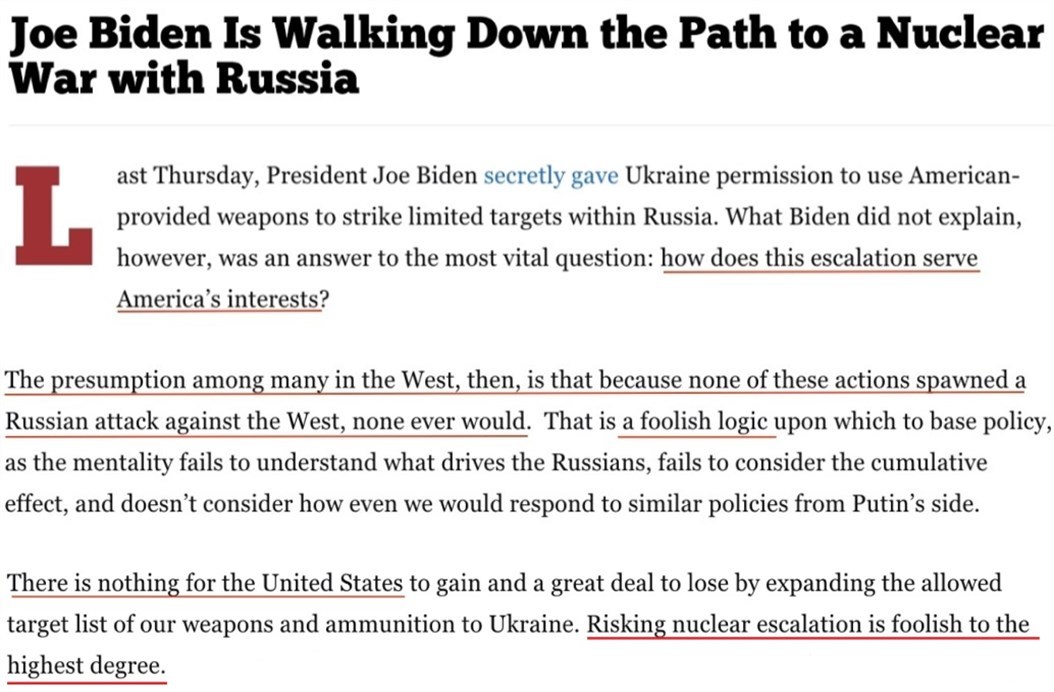文章認(rèn)為,允許烏克蘭擴大美援武器的打擊范圍對美國有百害而無一利。在美國安全并未受到威脅的情況下,冒險與俄羅斯爆發(fā)核戰(zhàn)爭簡直“蠢透了”。