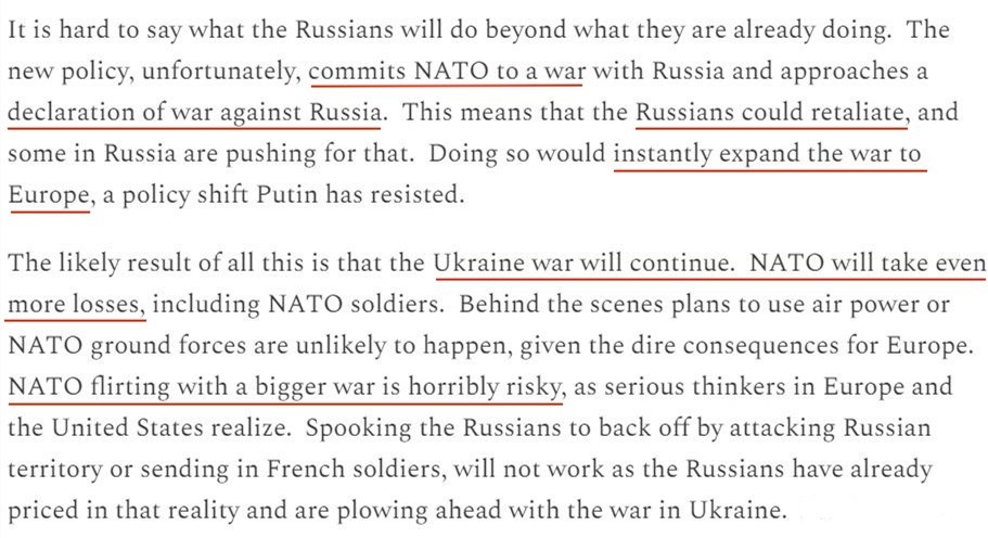 文章警告,美國等國家放寬援烏武器使用限制的新政策在事實上將北約拉進(jìn)了與俄羅斯的沖突中,并且已經(jīng)接近于對俄宣戰(zhàn)。這將導(dǎo)致俄烏沖突無限期繼續(xù)下去,最終令北約自身蒙受更多損失。
