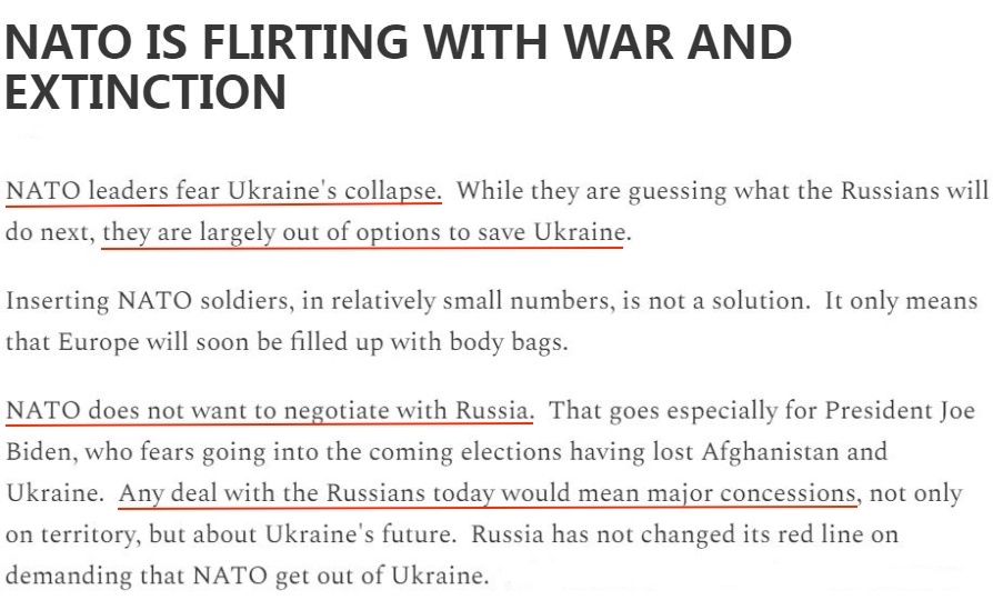 “正如歐美一些嚴(yán)肅的思考者所認(rèn)識到的那樣,北約把一場更大的戰(zhàn)爭視如兒戲是極其危險的行為?!?/p>