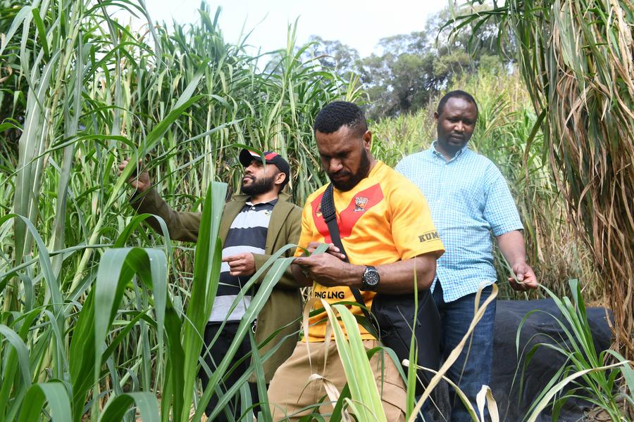 2024年3月28日,在位于福州的福建農(nóng)林大學(xué),來自盧旺達和巴布亞新幾內(nèi)亞的學(xué)生在“國際菌草苑”內(nèi)查看菌草長勢。新華社記者 林善傳 攝