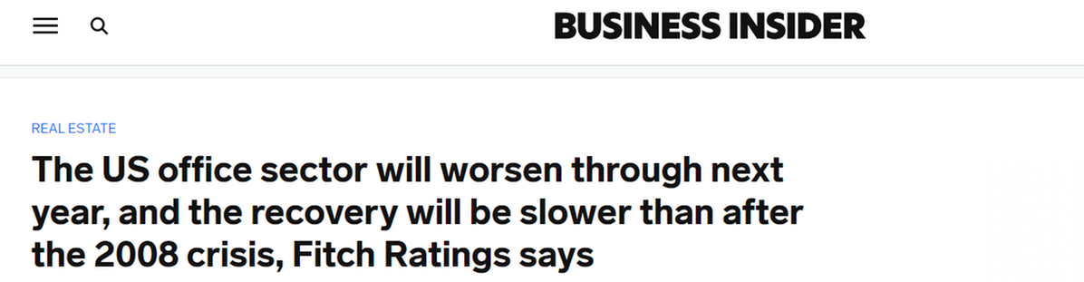 惠譽稱:“與2008年全球金融危機之后相比,此輪周期中寫字樓行業(yè)的復蘇將更加緩慢、耗時,并將導致美國房地產價值永久性受損、業(yè)績表現疲軟以及貸款損失增加。”