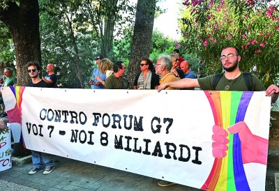 6月14日,在意大利法薩諾,抗議者打出“你們只有七個,我們是八十億人”的標(biāo)語,批評七國集團(tuán)與世界完全割裂。新華社記者 李京攝