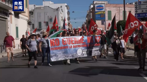 示威者在七國集團峰會舉辦地法薩諾市舉著反對戰(zhàn)爭的標語