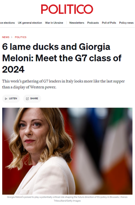 面對各自國內(nèi)嚴峻的政治形勢,本次G7峰會開得真有些力不從心、心猿意馬。法德兩國領導人所在政黨在上周剛剛結(jié)束的歐洲議會選舉中表現(xiàn)堪憂;英國首相蘇納克更在朝不保夕中擔憂著自己的保守黨會在下月初大選中走到窮途末路;美國總統(tǒng)拜登更是處處遭逢著大選對手特朗普的咄咄逼人。美國政客新聞網(wǎng)歐洲版(Politico.eu)捕捉到了這種有趣的心不在焉的會議氛圍,以《六只跛腳鴨和梅洛尼》為題諷刺總結(jié)本次峰會,“在意大利舉行的七國集團峰會看起來更像是最后的晚餐,而不是西方力量的展示”。