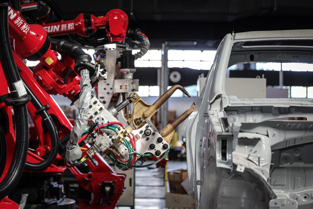 這是6月3日拍攝的點(diǎn)焊機(jī)器人。機(jī)器人被廣泛應(yīng)用于產(chǎn)業(yè)轉(zhuǎn)型升級(jí)的現(xiàn)實(shí)場景中,它們能夠勝任繁重、危險(xiǎn)或復(fù)雜的工作,提高生產(chǎn)效率和經(jīng)濟(jì)效益。新華社記者潘昱龍攝