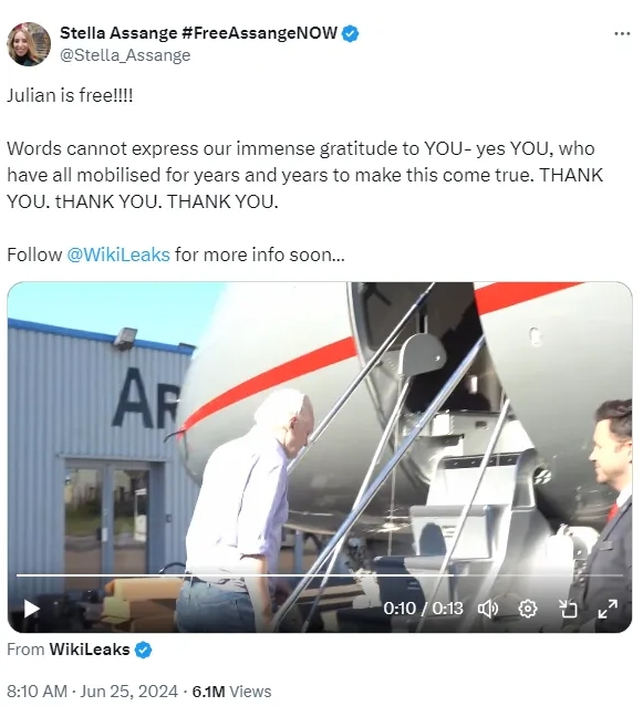 最終,在2024年6月,在經(jīng)歷了無數(shù)次開庭、裁決、上訴,經(jīng)歷了漫長的等待、堅持和呼吁后,阿桑奇與美國方面達成認罪協(xié)議的消息傳出。26日,阿桑奇在位于塞班島的美國聯(lián)邦法院對一項違反美國間諜法的重罪認罪。