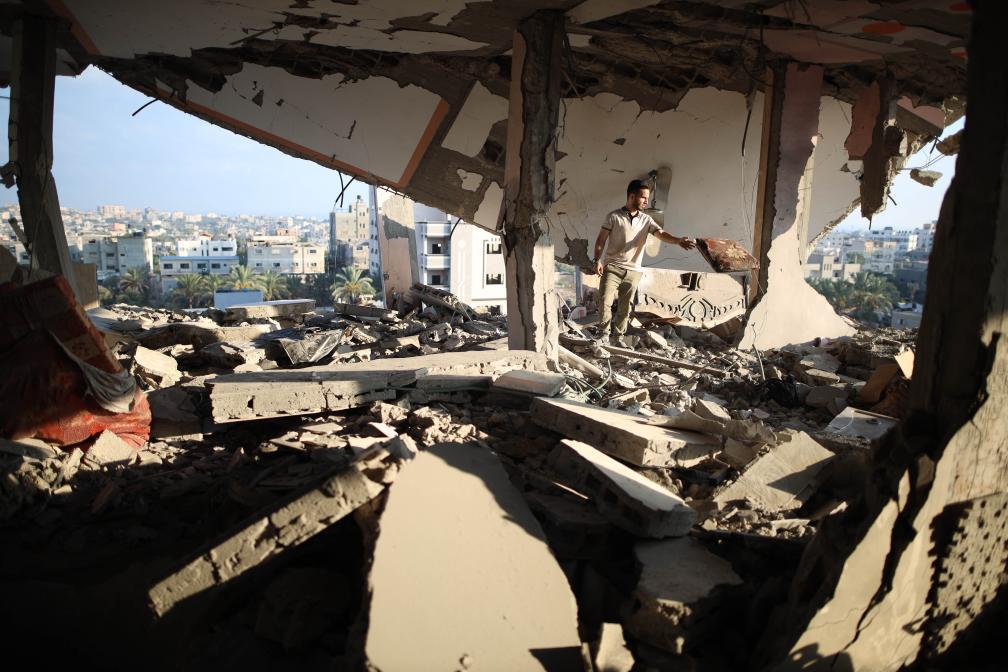 7月18日,在加沙地帶中部努賽賴特難民營(yíng),一名男子查看遭到以軍襲擊的建筑廢墟。新華社發(fā)(馬爾萬(wàn)·達(dá)烏德攝)