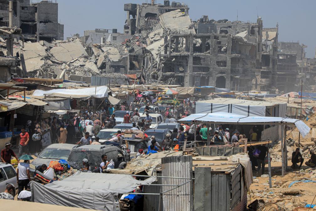 7月22日,在加沙地帶南部城市汗尤尼斯,人們逃離家園。巴勒斯坦加沙地帶衛(wèi)生部門22日說(shuō),以色列軍隊(duì)當(dāng)天轟炸汗尤尼斯,造成至少70人死亡、超過(guò)200人受傷。新華社發(fā)(里澤克·阿卜杜勒賈瓦德攝)