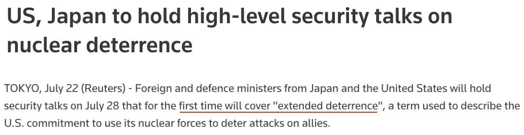 據(jù)多家外媒報(bào)道,日本和美國(guó)將于本月28日在東京舉行兩國(guó)外交部長(zhǎng)和國(guó)防部長(zhǎng)“2+2”會(huì)談,首次討論“延伸威懾”,即美國(guó)承諾使用包括核武器在內(nèi)的軍事力量保護(hù)盟國(guó)的問(wèn)題。