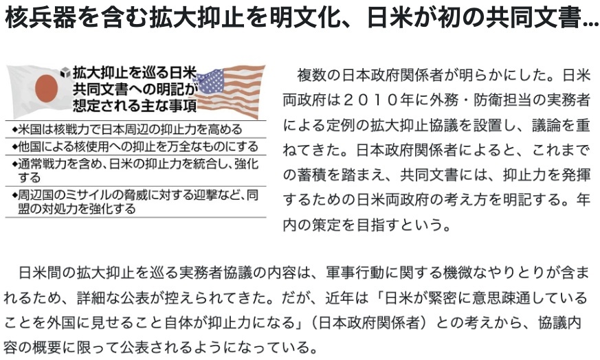 日本《讀賣(mài)新聞》援引未具名日本政府消息人士的話報(bào)道稱(chēng),日美兩國(guó)的目標(biāo)是在今年年內(nèi)出臺(tái)關(guān)于“延伸威懾”的首份聯(lián)合文件,其中將清楚地闡明“美國(guó)堅(jiān)定不移捍衛(wèi)日本”的承諾。