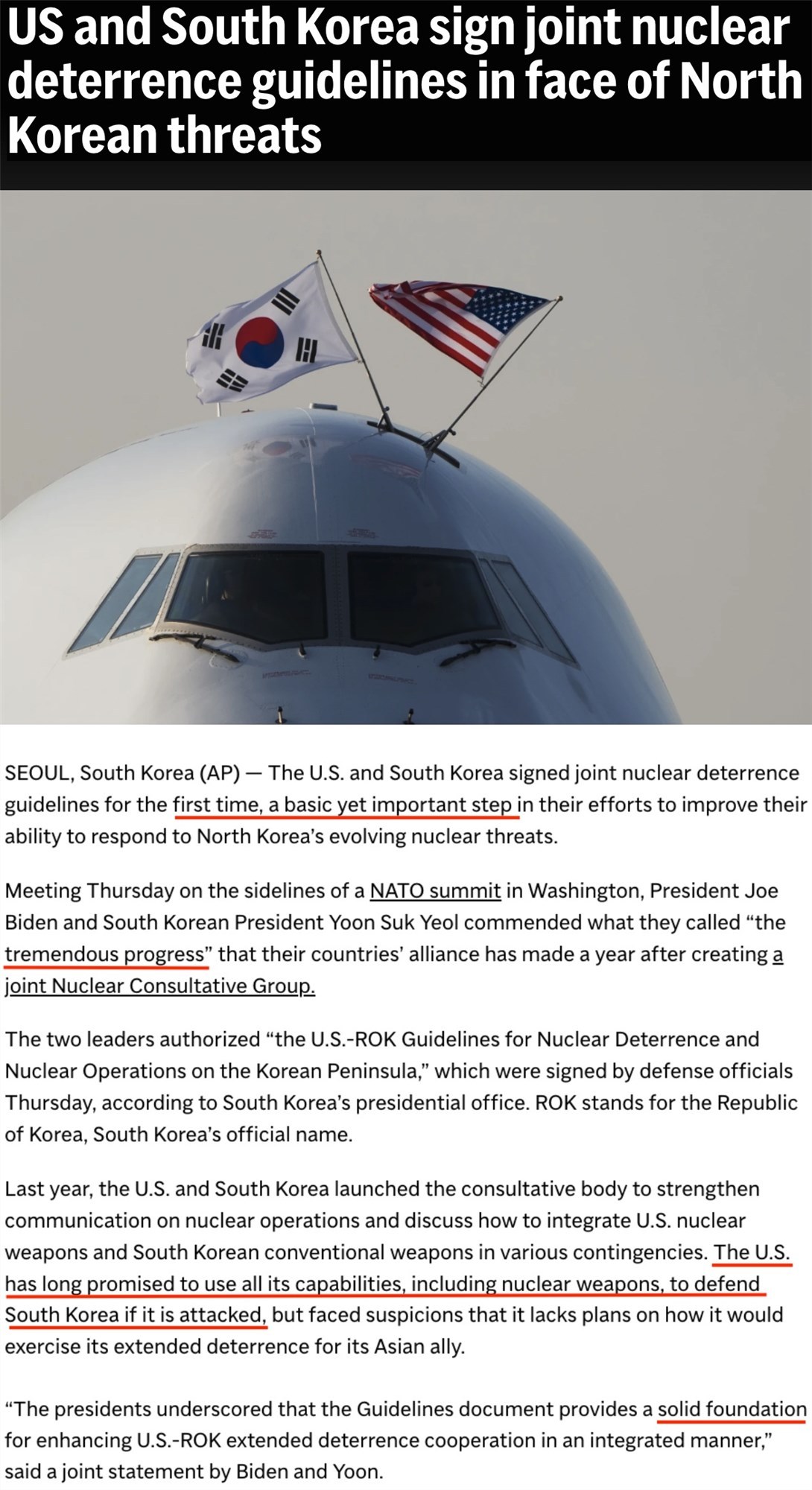本月11日,在北約華盛頓峰會(huì)間隙,美韓兩國(guó)國(guó)防部官員簽署《美韓關(guān)于朝鮮半島核威懾與核作戰(zhàn)的指導(dǎo)方針》。這也是兩國(guó)首次簽署此類(lèi)文件,被認(rèn)為是“兩國(guó)努力提高應(yīng)對(duì)朝鮮核威脅能力的基本且重要的一步”。