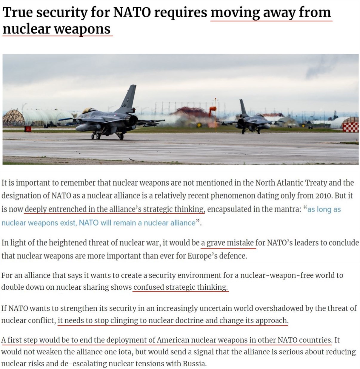 文章指出,《北大西洋公約》中并沒(méi)有提到核武器,但如今,它已深深根植于北約的戰(zhàn)略思想之中。鑒于核戰(zhàn)爭(zhēng)危險(xiǎn)的加劇,北約領(lǐng)導(dǎo)人如果斷定核武器對(duì)歐洲防務(wù)比以往任何時(shí)候都重要,那將是一個(gè)嚴(yán)重的錯(cuò)誤。