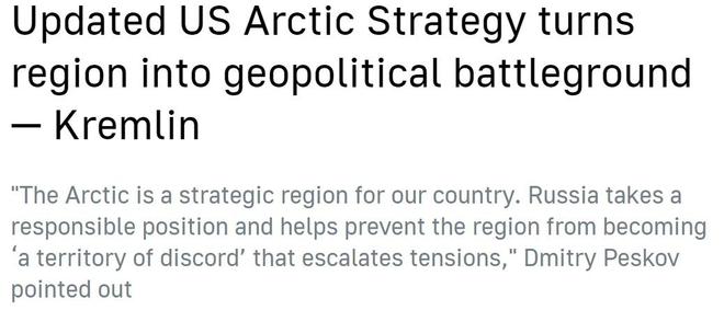 在被問(wèn)及對(duì)美國(guó)這份北極戰(zhàn)略報(bào)告的看法時(shí),俄羅斯總統(tǒng)新聞秘書(shū)佩斯科夫指出,美方報(bào)告顯示出對(duì)抗色彩,而俄羅斯一直在北極問(wèn)題上采取負(fù)責(zé)任的立場(chǎng),"為確保北極不會(huì)成為紛爭(zhēng)和局勢(shì)緊張地區(qū)做出貢獻(xiàn)"。