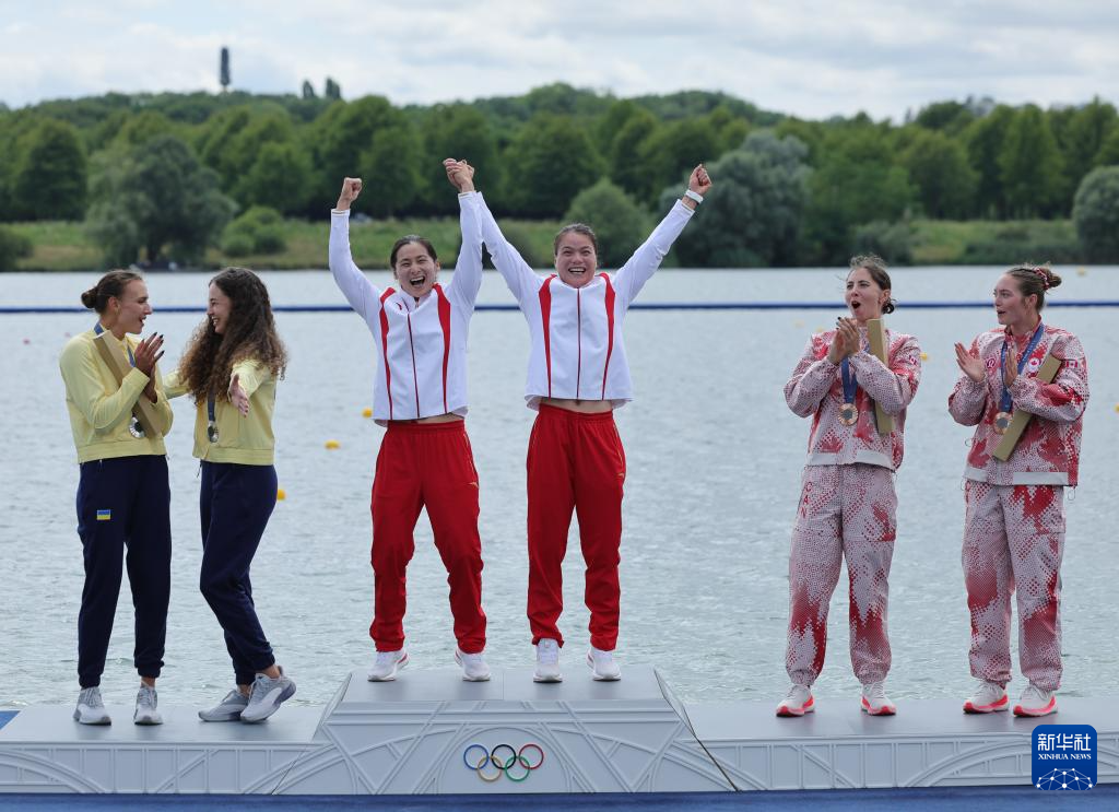 8月9日,季軍加拿大組合斯隆·麥肯齊(左)/凱蒂·文森特在頒獎儀式上。新華社記者 沈伯韓 攝