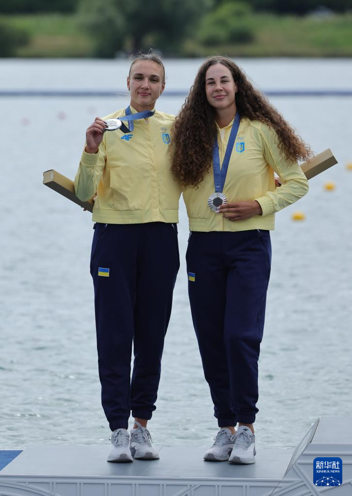 8月9日,亞軍烏克蘭組合柳德米拉·盧然(右)/阿納斯塔西婭·切特維里科娃在頒獎儀式上。新華社記者 沈伯韓 攝