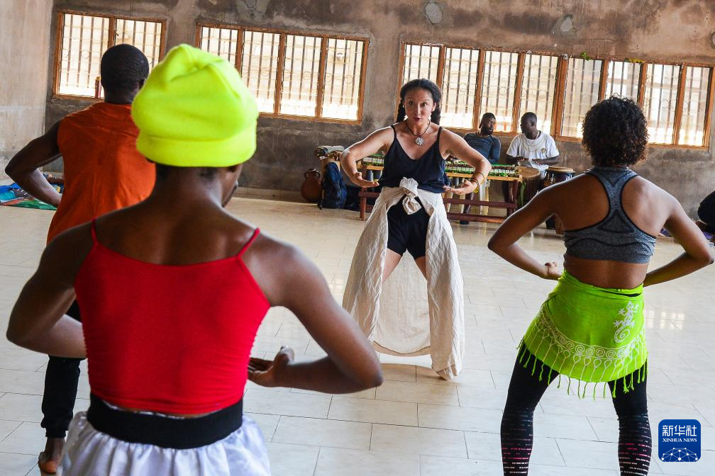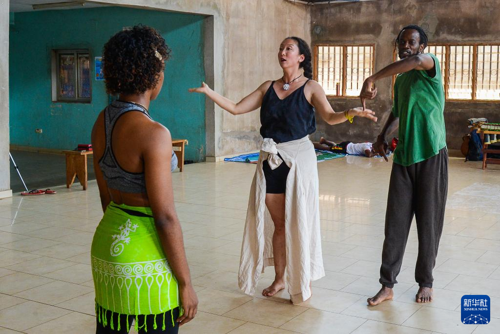 2月14日,在喀麥隆首都雅溫得,中國舞蹈演員蔣可鈺(中)指導(dǎo)當(dāng)?shù)匚枵呔毩?xí)。 新華社發(fā)(科普索攝)