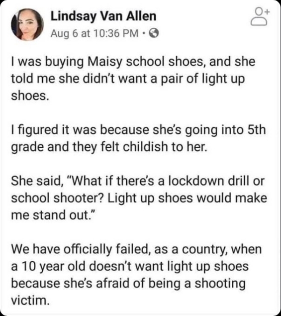 網(wǎng)友@tiggermenow也講述了類似的事情:“我兒子上幼兒園的第二周還是第三周的時(shí)候,有一次他回家說需要新鞋,而當(dāng)時(shí)他穿的鞋才買了不到一個(gè)月。那時(shí)候幼兒園組織了一次槍擊預(yù)防演習(xí),他被告知他那雙能發(fā)光的鞋子對(duì)于他自己還有他的同學(xué)來說都很危險(xiǎn)。”
