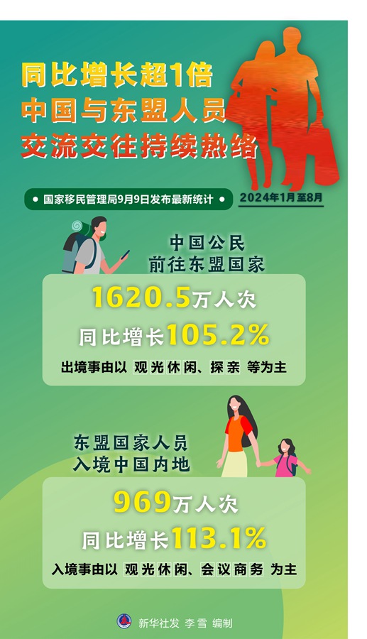 國家移民管理局9日發(fā)布最新統(tǒng)計,2024年1月至8月,中國公民前往東盟國家1620.5萬人次,同比增長105.2%,出境事由以觀光休閑、探親等為主;東盟國家人員入境中國內(nèi)地969萬人次,同比增長113.1%,入境事由以觀光休閑、會議商務為主。