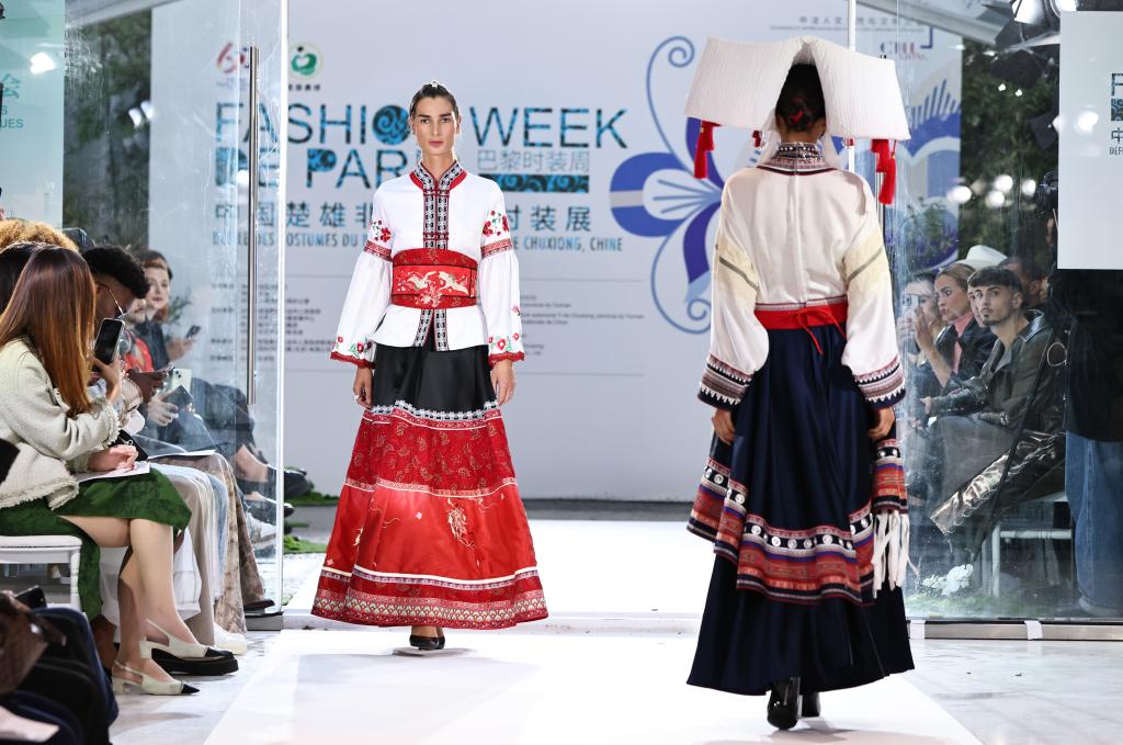9月26日,模特在法國巴黎舉行的中國楚雄彝族服飾非遺時(shí)裝展上展示時(shí)裝。新華社記者 高靜 攝