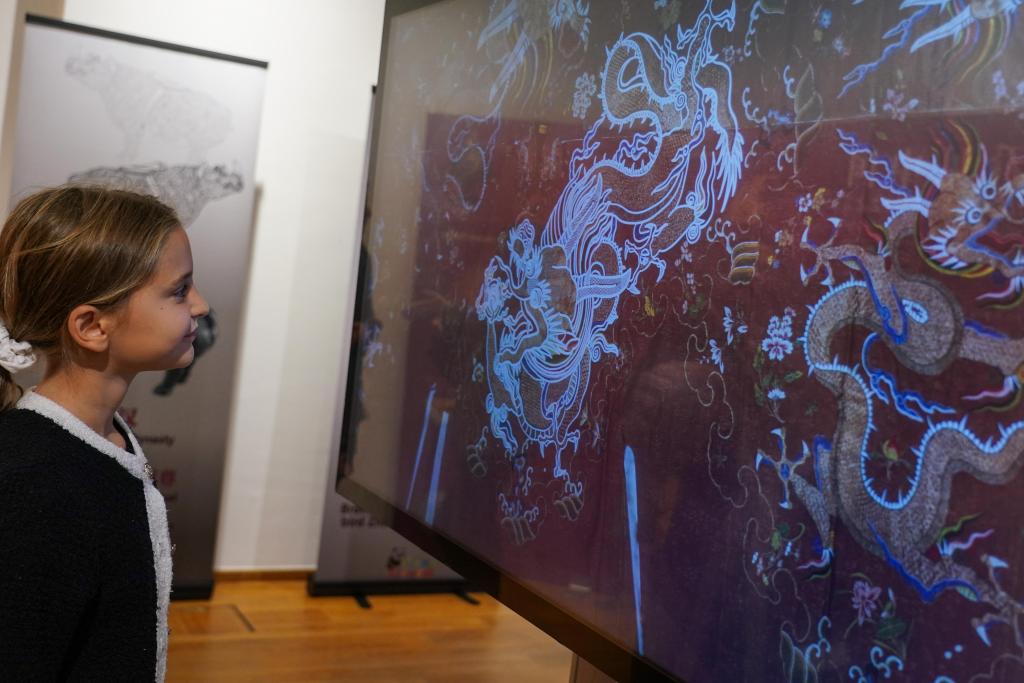 9月27日,在比利時(shí)布魯塞爾中國文化中心,觀眾在“看見中國”之《紋樣與色彩:中華工藝之美》數(shù)字文化展上參觀。新華社記者 彭子洋 攝