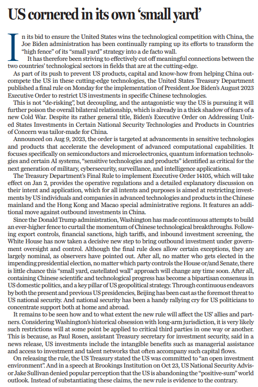 此前,外界普遍認(rèn)為美國正在放棄“正和”的世界觀。10月23日,美國總統(tǒng)國家安全事務(wù)助理沙利文在布魯金斯學(xué)會(huì)上發(fā)言時(shí)否認(rèn)了這一說法。隨后,美國財(cái)政部在發(fā)布最終規(guī)則時(shí)也表示,美國致力于建設(shè)“開放的投資環(huán)境”。然而,最終規(guī)則的發(fā)布,終究讓美國的“言”與“行”背道而馳。