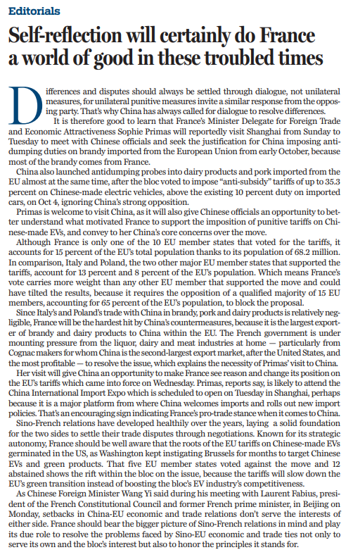 歐盟加征關(guān)稅的措施生效之際,普里馬斯的到訪(fǎng)將給中國(guó)提供一個(gè)說(shuō)服法國(guó)、改變法國(guó)的機(jī)會(huì)。據(jù)報(bào),普里馬斯將出席定于11月5日在上海開(kāi)幕的進(jìn)博會(huì)。進(jìn)博會(huì)以進(jìn)口為主題,是中國(guó)推動(dòng)高水平開(kāi)放的平臺(tái)。一直以來(lái),法國(guó)對(duì)華展現(xiàn)出的自由貿(mào)易立場(chǎng),令人鼓舞。