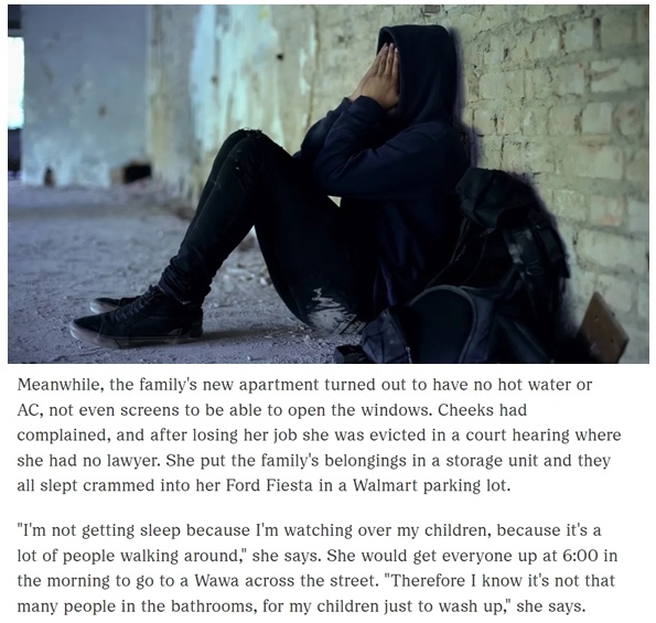 在弗吉尼亞州生活的奇克斯是一位獨自撫養(yǎng)四個孩子的母親。由于失業(yè)后無力負(fù)擔(dān)房租,她和四個孩子的臨時住房是一輛小轎車,這輛車長期停在一家超市的停車場里。