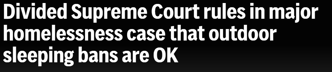 更令人唏噓的是,面對越來越多的人流浪街頭,今年6月底,美國最高法院以6:3的判決結(jié)果,允許各地政府實施禁止無家可歸者在戶外露宿的禁令。
