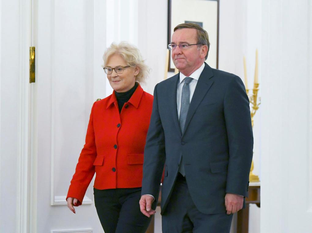 2023年1月19日,在德國(guó)柏林的總統(tǒng)府,皮斯托里烏斯(右)步入儀式現(xiàn)場(chǎng)。德國(guó)總統(tǒng)施泰因邁爾當(dāng)日向鮑里斯·皮斯托里烏斯頒發(fā)任命書,正式任命其為國(guó)防部長(zhǎng)。新華社記者任鵬飛攝