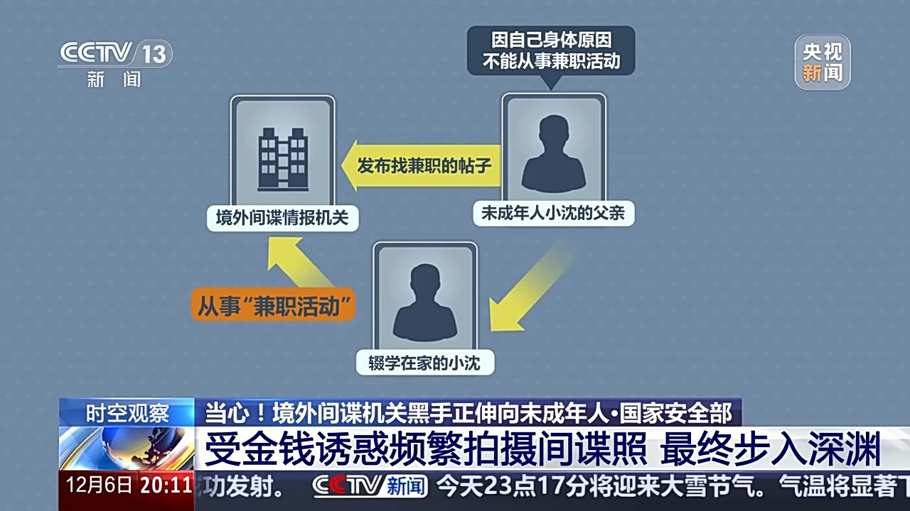 國際關系學院法學院教師 孔祥承:境外間諜機關目前都采取的是一種合法掩飾非法、公開掩護秘密的方式,對未成年人進行一個拉攏策反。在多數情況下,他們會比如說偽裝成知心大姐、知心哥哥的方式,然后去影響這些未成年人,因為一些未成年人往往涉世不深,就被他們的甜言蜜語所誘惑,而逐漸被他們所利用。可能還有一些更為惡劣的情況,比如說一旦一些未成年人意識到這是一個間諜行為,想及時收手,那么境外的間諜機關也會利用他之前的行為作為把柄威脅他,導致他不得不繼續(xù)從事相關的行為,受他們的擺布,成為一個傀儡。