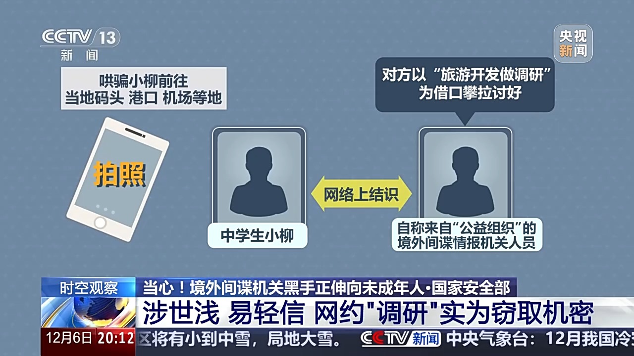 中學生小柳在網絡上結識了一名自稱來自“公益組織”的境外間諜情報機關人員,對方以“旅游開發(fā)做調研”為借口攀拉討好,哄騙小柳前往當地碼頭、港口、機場等地拍照,逐步發(fā)展至收集有關重要軍事設施地點的照片和相關信息,小柳還因此收取了“酬勞”數千元。涉世未深的小柳在沒有意識到問題嚴重性的情況下輕易相信了對方,沒想到自己的行為已經對我國軍事安全和國家安全構成了嚴重威脅。