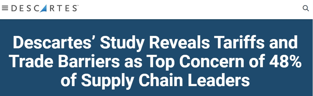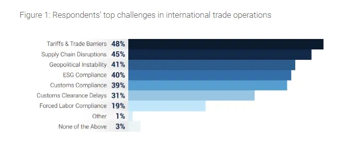調(diào)查顯示,48%的受訪者認(rèn)為關(guān)稅和貿(mào)易壁壘上升是他們最擔(dān)心的問題,緊隨其后的是供應(yīng)鏈中斷(45%)和地緣政治不穩(wěn)定(41%)。此外,無論所在公司規(guī)模大小,受訪者都將關(guān)稅和貿(mào)易壁壘列為當(dāng)前面臨的首要問題。這項(xiàng)報(bào)告共調(diào)查了978名來自歐洲、北美、南美和亞太地區(qū)主要貿(mào)易國的供應(yīng)鏈領(lǐng)域領(lǐng)導(dǎo)者。