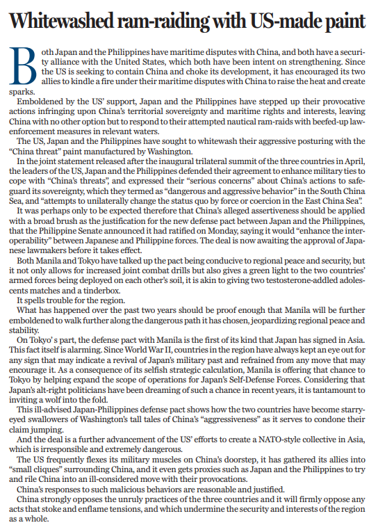 這一不明智的日菲防務(wù)協(xié)定表明,這兩個(gè)國(guó)家已經(jīng)盲目聽(tīng)信美國(guó)編造的所謂中國(guó)“咄咄逼人”的論調(diào),并以此為借口為其攫取權(quán)益的行為開(kāi)脫。