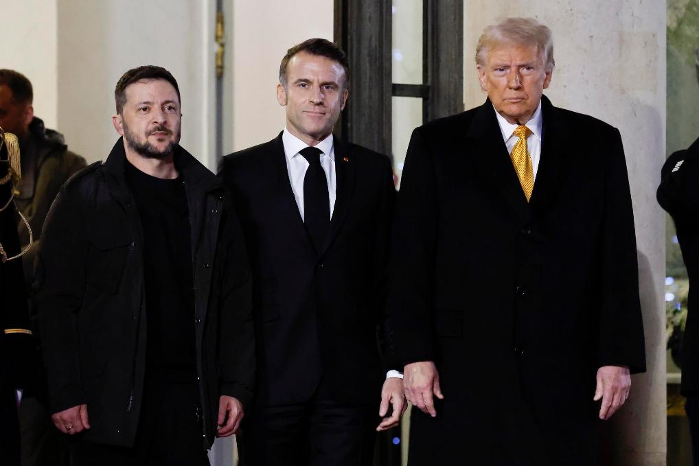 12月7日,法國總統(tǒng)馬克龍(中)與美國當(dāng)選總統(tǒng)特朗普(右)和烏克蘭總統(tǒng)澤連斯基會晤后走出愛麗舍宮。新華社發(fā)(亨利·施瓦茨攝)