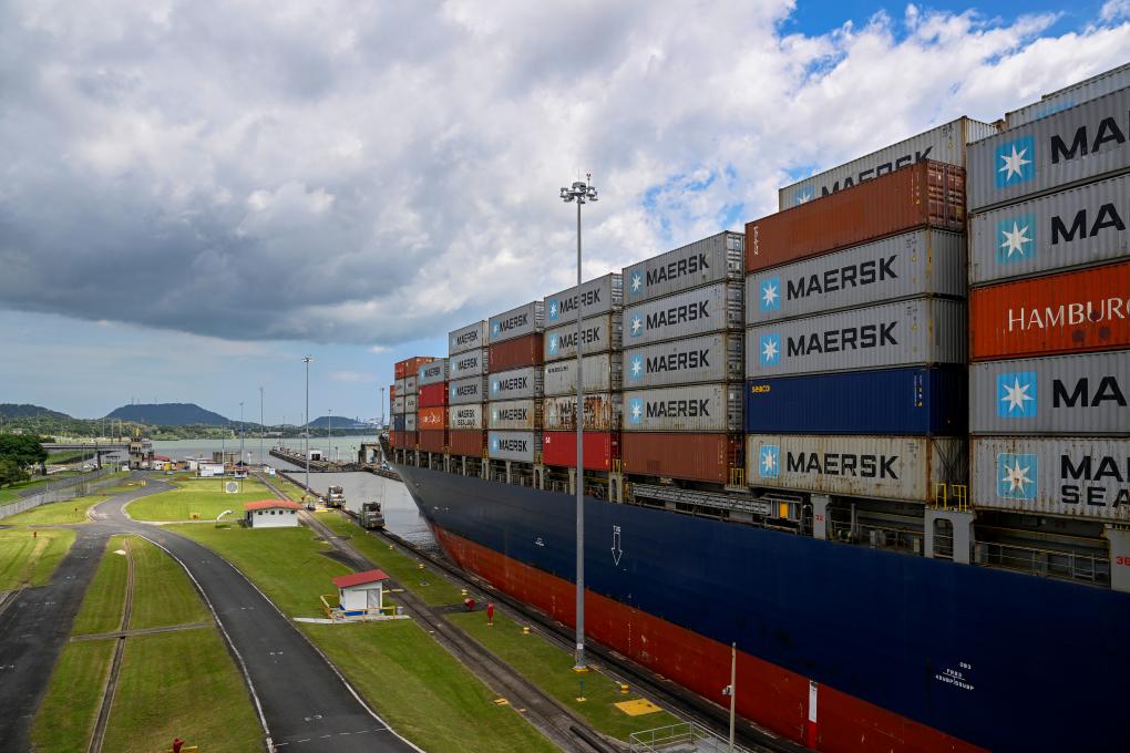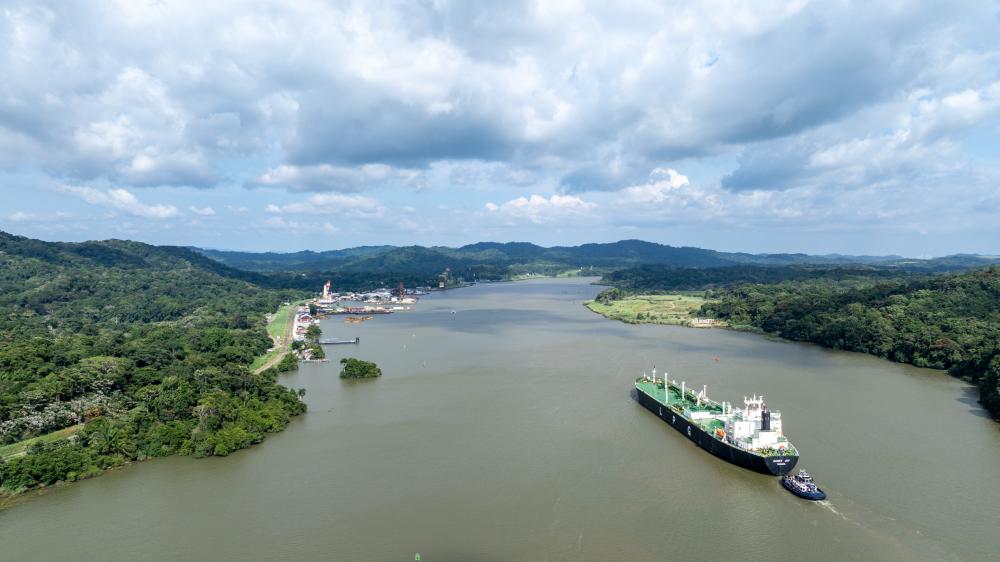 8月28日,在巴拿馬首都巴拿馬城附近,一艘貨輪通過巴拿馬運河的米拉弗洛雷斯船閘準(zhǔn)備駛?cè)胩窖蟆P氯A社記者李木子攝