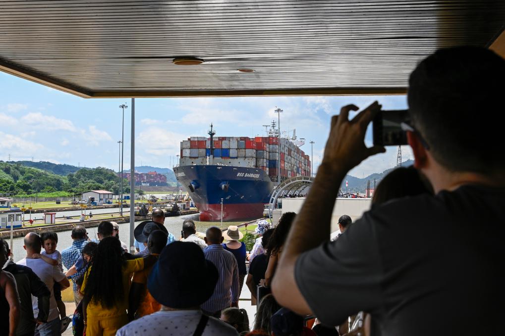 8月28日,在巴拿馬首都巴拿馬城附近,游客在巴拿馬運河的米拉弗洛雷斯船閘游客中心觀看貨輪通過船閘駛?cè)胩窖蟆P氯A社記者李木子攝