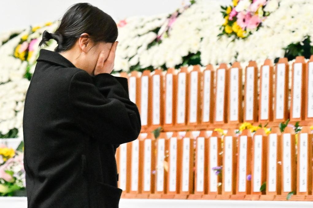 12月30日,遇難者家屬在韓國務(wù)安當(dāng)?shù)卦O(shè)置的靈堂內(nèi)哀悼親人。新華社發(fā)(全休相攝)