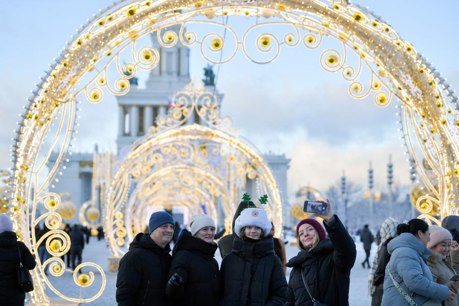 2024年12月31日,人們?cè)诙砹_斯首都莫斯科的新年裝飾前自拍。新華社發(fā)(亞歷山大攝)