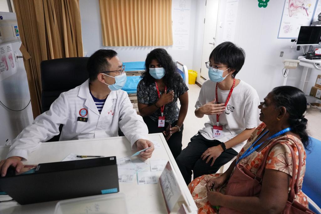 2024年12月24日,在斯里蘭卡科倫坡港,中國海軍“和平方舟”號醫(yī)院船上的醫(yī)生在志愿者的幫助下對當(dāng)?shù)鼗颊哌M行問診。(新華社記者伍岳攝)