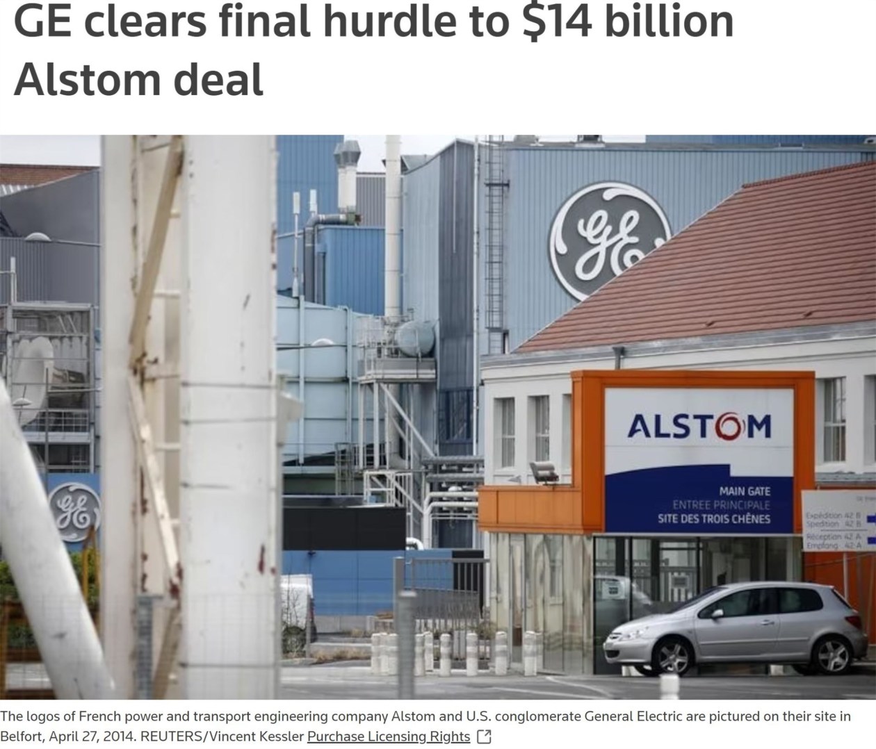 △路透社:2015年9月,美國通用電氣公司掃清了以140 億美元收購阿爾斯通電力設(shè)備業(yè)務(wù)的最后障礙。