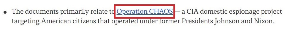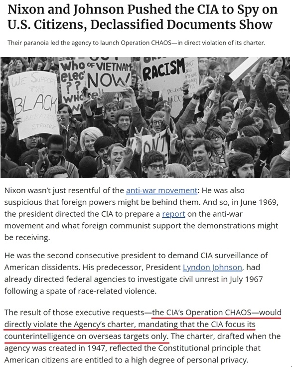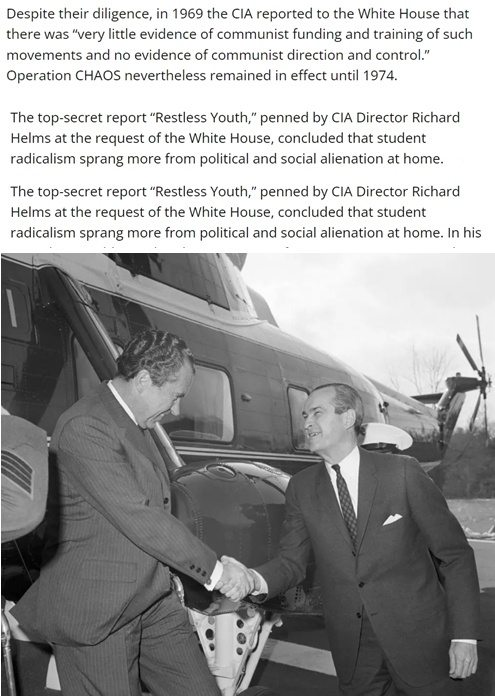 繼任的尼克松進一步擴大了“混沌行動”,并于1969年6月明確指示中情局準備一份關(guān)于美國國內(nèi)反戰(zhàn)運動以及這些運動可能得到“外國支持”的報告。