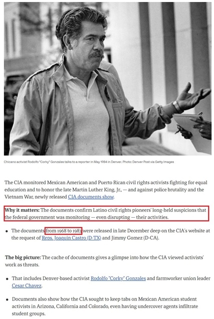 文件揭示,從1968年到1983年,中情局一直在監(jiān)聽、監(jiān)視魯?shù)婪颉ぁ翱苹薄_雷斯和塞薩爾·查韋斯等美國拉美裔民權(quán)活動人士的一舉一動。他們均長期致力于要求實現(xiàn)平權(quán)和消除貧困。