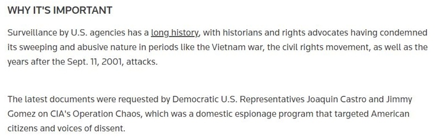 正如路透社所說,美國政府機構(gòu)的監(jiān)聽監(jiān)視行為歷史悠久,歷史學家和民權(quán)倡導人士在越南戰(zhàn)爭時期、民權(quán)運動時期以及“9·11事件”發(fā)生后的歲月里,都曾譴責過這種行為的廣泛和濫用性質(zhì)。