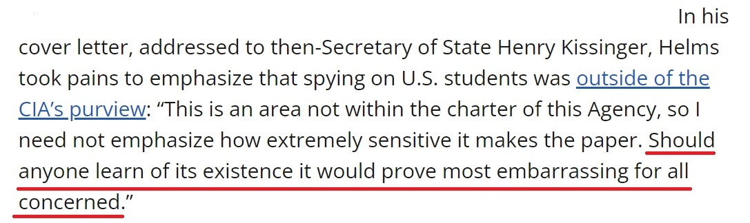 就像時任中情局局長赫爾姆斯1970年在寫給時任國務(wù)卿基辛格的信中所說,監(jiān)視美國學生不在中情局的職權(quán)范圍內(nèi),“如果有人知道了‘混沌行動’的存在,對所有相關(guān)者來說都將是非常尷尬的事情”。