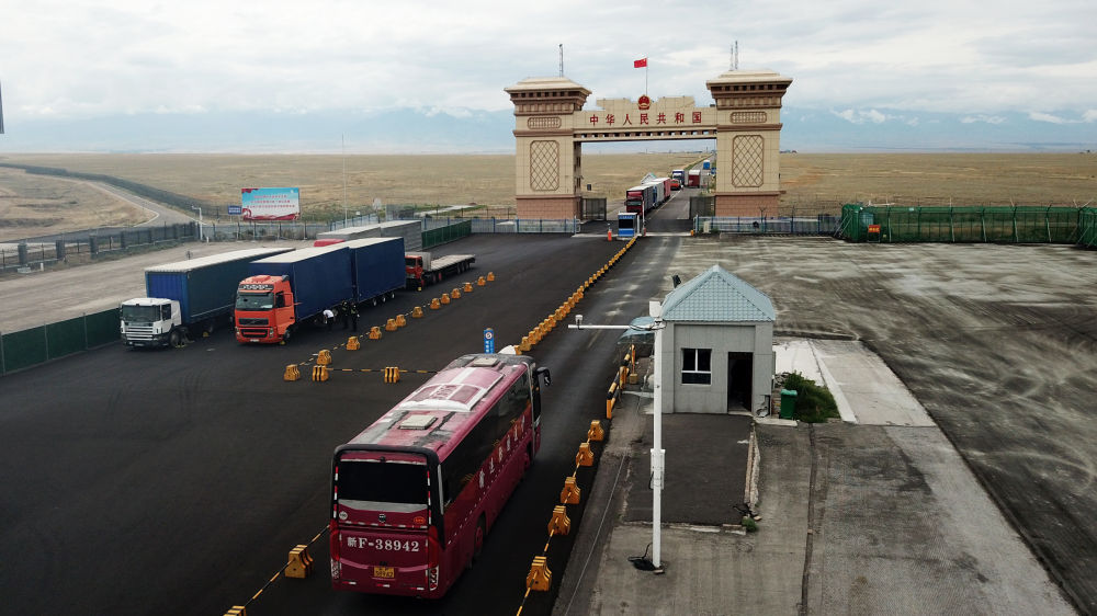2024年7月15日,一輛國際客運(yùn)班車即將駛出國門,前往哈薩克斯坦(無人機(jī)照片)。新華社記者張嘯誠攝