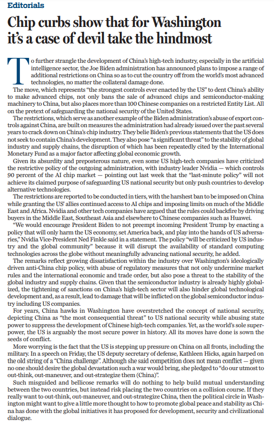 1月13日,拜登政府在卸任前夕出臺(tái)人工智能相關(guān)出口管制措施,進(jìn)一步加嚴(yán)對(duì)人工智能芯片、模型參數(shù)等出口管制,還拓展了長(zhǎng)臂管轄,對(duì)第三方與中國(guó)開展正常貿(mào)易設(shè)置障礙、橫加干涉。拜登政府的這一舉措完全無(wú)視后果,旨在進(jìn)一步遏制中國(guó)高科技產(chǎn)業(yè),尤其是人工智能領(lǐng)域的發(fā)展。