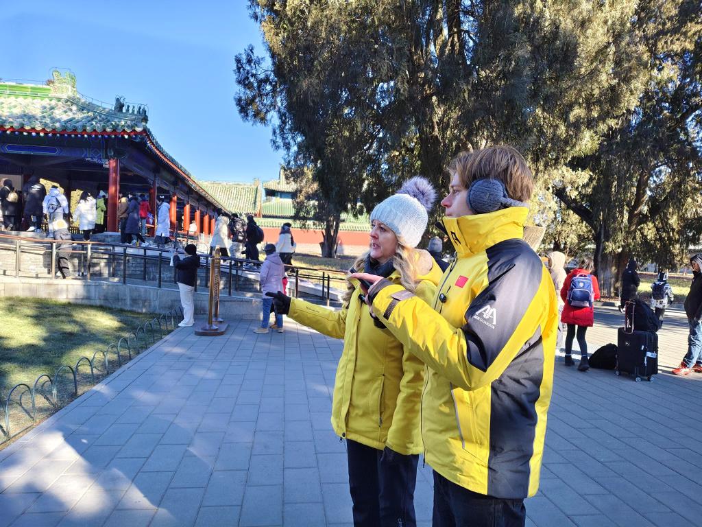 祈年殿、皇穹宇、圜丘……路過(guò)一個(gè)個(gè)景點(diǎn),記者為他們介紹起建筑背后的歷史和“天人合一”理念,母子二人聽得津津有味。當(dāng)天北京戶外溫度低至零下8攝氏度,手凍得生疼,但絲毫未影響埃米爾和媽媽拍照記錄的熱情。