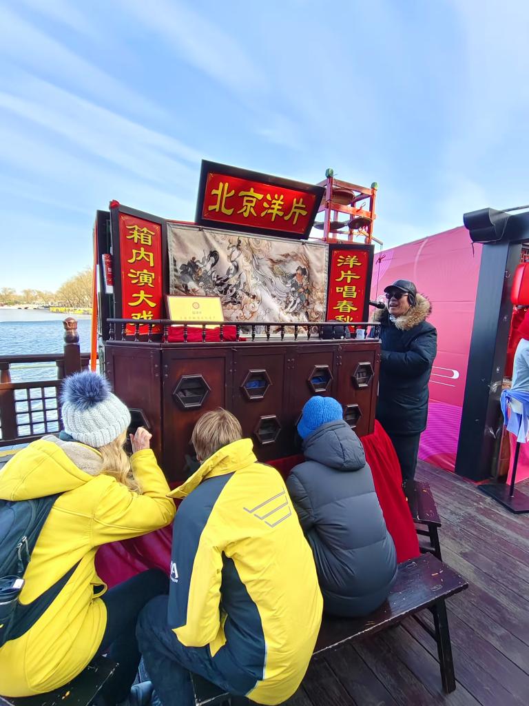 走入北京歷史文化街區(qū)什剎海的新春集市,年味彌漫在文化產(chǎn)品、特色小吃和藝術(shù)表演中。不遠(yuǎn)處的鑼鼓唱戲聲吸引了母子二人,原來(lái)是民間藝術(shù)北京洋片在表演《西游記》。坐在一個(gè)約1米高、2米寬的木箱前,透過(guò)箱上圓孔能看到里面不斷切換的畫片。二人全神貫注的表情,讓人感到不同文化仿佛跨越時(shí)空和國(guó)度,在這里定格。