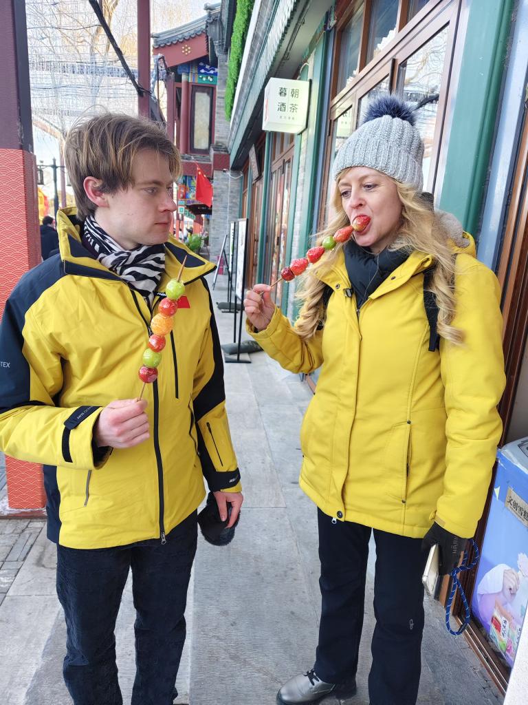 烏爾麗克與埃米爾在什剎海吃糖葫蘆。新華社記者于佳欣 攝