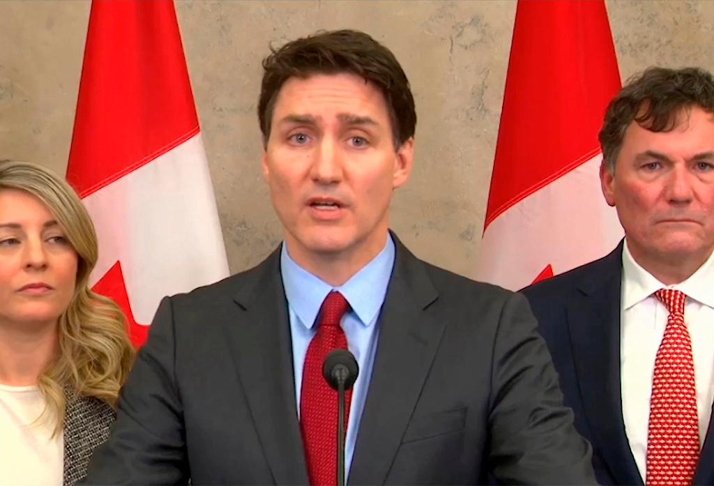2025年2月1日,加拿大總理特魯多(中)在渥太華接受媒體采訪(視頻截圖)。新華社發(fā)